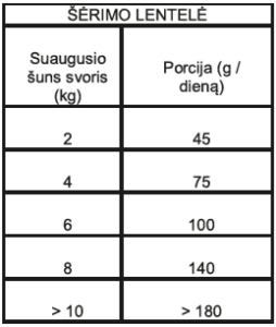 Šėrimo instrukcija: pateikite sausą ėdalą rekomenduojamomis porcijomis (žr. šėrimo lentelę). Lentelėje nurodyti kiekiai gali skirtis nuo šuns svorio, fizinio aktyvumo ir kitų veiksnių. Keičiant pašarą pereinamasis laikotarpis turėtų trukti 4-5 dienas, kad būtų išvengta virškinimo sutrikimų. Labai svarbu, kad gyvūnas visada turėtų pakankamai šviežio, švaraus geriamo vandens. Pakuotę laikyti sandariai uždarytą, sausoje, vėsioje vietoje, apsaugotoje nuo tiesioginių saulės spindulių. Netinkamas vartoti žmonėms. Grynasis kiekis: 2 kg/6 kg. Geriausias iki: ir partijos Nr.: žr. ant pakuotės.